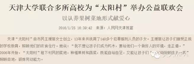 天津“太阳村”由市民王瑷丽女士创立,13年来共抚育了140多个犯罪服刑人员的子女。王瑷丽让孩子们接受正规的学校教育,照顾他们的衣食住行。2006年开始,“太阳村”租下村民的菜地,种植果树和蔬菜,既能自给自足,又能让孩子们“像父母照顾孩子一样”照顾田地,锻炼劳动能力。每当有爱心人士愿意提供财物支持时,王瑷丽会恳请他们通过认养果树菜地以购买肥料及雇工的形式,让孩子们带着责任感和成就感去做事,待到收获时请好心人们去采摘。