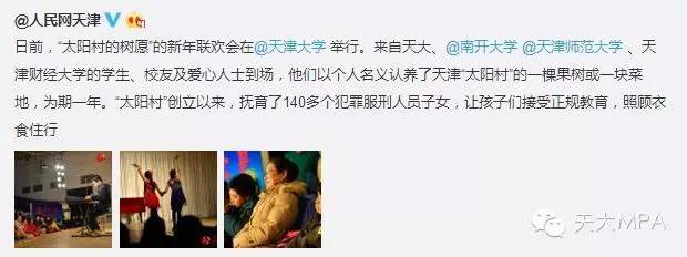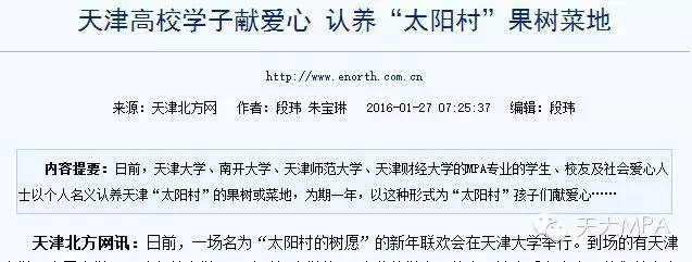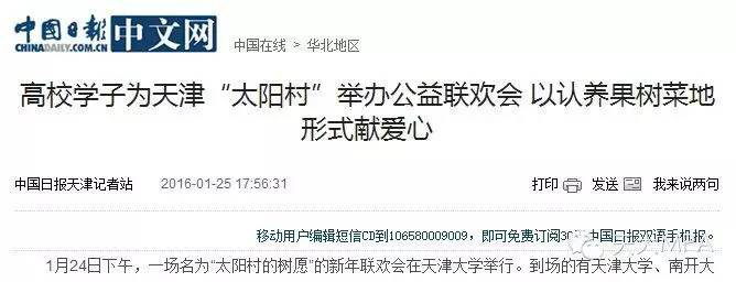 1月24日下午,一场名为“太阳村的树愿”的新年联欢会在天津大学举行。到场的有天津大学、南开大学、天津师范大学、天津财经大学的MPA专业的学生、校友及社会爱心人士。他们以个人名义认养了天津“太阳村”的一棵果树或一块菜地,为期一年,以这种形式培养“太阳村”孩子们的社会责任感。