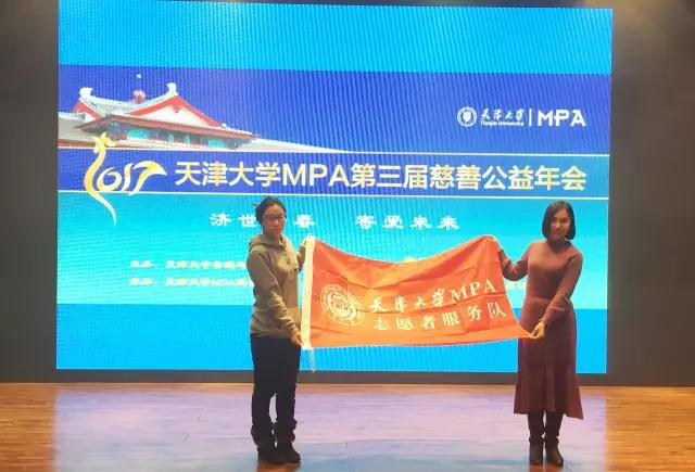 年会上,天津大学MPA第三届志愿者服务队代表张锡旺做了2016年公益总结,高飞老师与第四届志愿者服务队队长王筱雅进行了队旗交接,将爱心的火种源源不断地传递下去。天津大学MPA志愿者服务队自2014年成立以来,一直活跃在河东特教中心、太阳村、儿童福利院、南大港湿地等处,帮扶困难儿童、勇站“8•12”前线、践行在环境保护第一线,具有良好的社会影响力。目前,已经产生的四届志愿者服务队队长,均由MPA在校生担任。