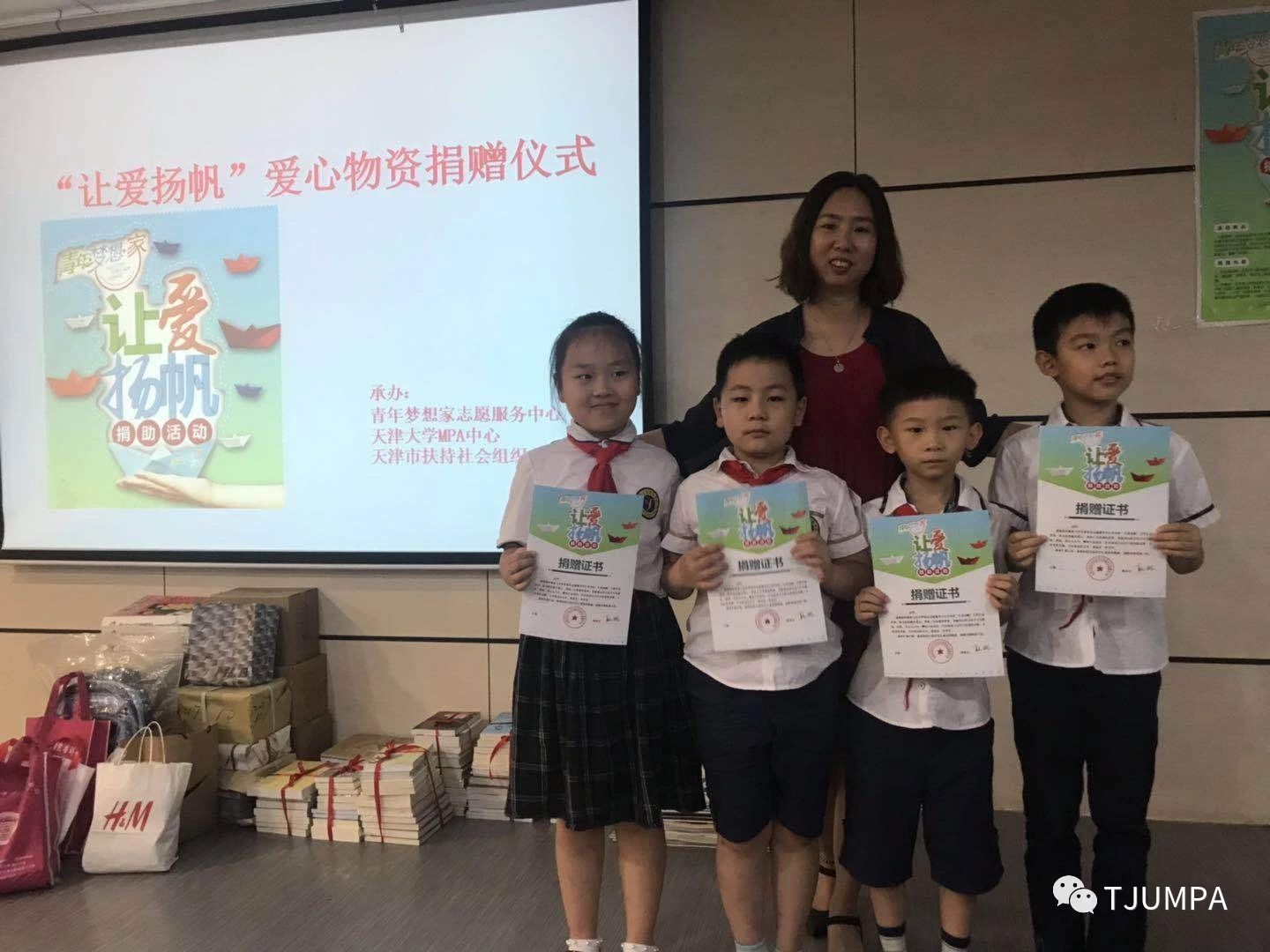 天津大学MPA联合会主席马晓琳,耀华中学家长代表王全存,学生代表五人宣读捐赠明细并发表活动感言。天津大学MPA中心捐赠书籍300余册,食品20箱,耀华中学捐赠爱心物资共计两千八百余件套,包括书籍、文具、衣物等。开发区团委书记李诗南为天津大学MPA中心、耀华志愿服务队及逸阳梅江湾国际学校同学颁发捐赠证书。