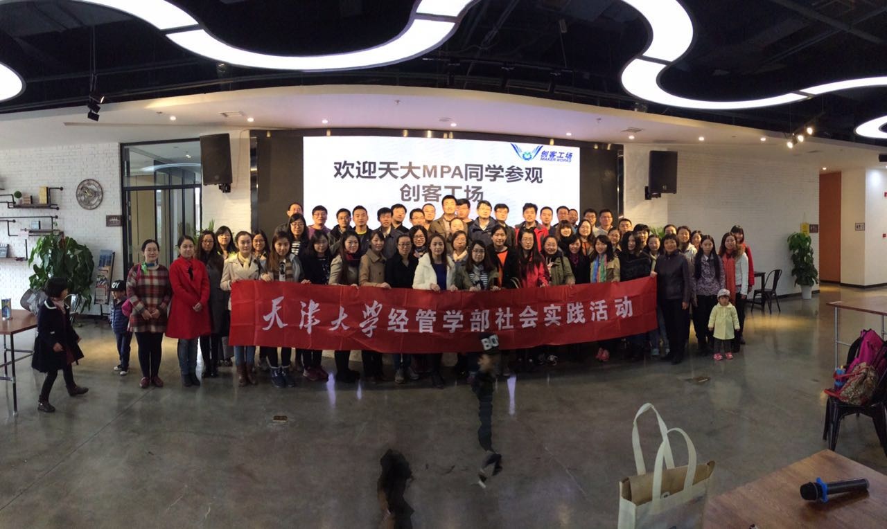 2015年11月1日上午,在经管学部领导及老师的带领下,天津大学2014级MPA双证班一行53人前往津南区开展社会实践活动。第一站首先抵达了位于北闸口镇天乐创新产业园的创客工厂,在一层创客咖啡听取了项目情况简介,随后参观了位于二层的创客学院、三层的创客联合办公空间及四层的创客公寓,亲身感受了智能门锁、轨道交通、太阳能水杯、3D打印机、胶囊公寓等各类智能产品的崭新创意。