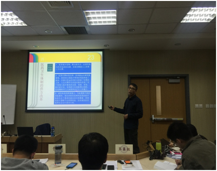 在同学们分组踊跃发言之后,闫老师再对大家的观点进行总结,让大家更深入地理解授课的内容。上午讨论的案例是“神木医改”。在讨论结束后,闫老师专程邀请到了天津市医疗保险研究会副秘书长刘俊,就新医改的供给侧改革进行深度解读。之后的一个半小时,刘秘书长以医改的“四梁八柱”体系作为基础,深入浅出地讲解了医疗服务、医疗改革、医疗服务的精细化管理、医保支付制度的改革、医疗体制改革中公平与效率之间的关系以及医改中最重要的环节筹资等内容。刘秘书长用详实的数据、专业的理论把医改的供给侧改革清晰地展现出来,同学们听得意犹未尽,报以热烈的掌声。