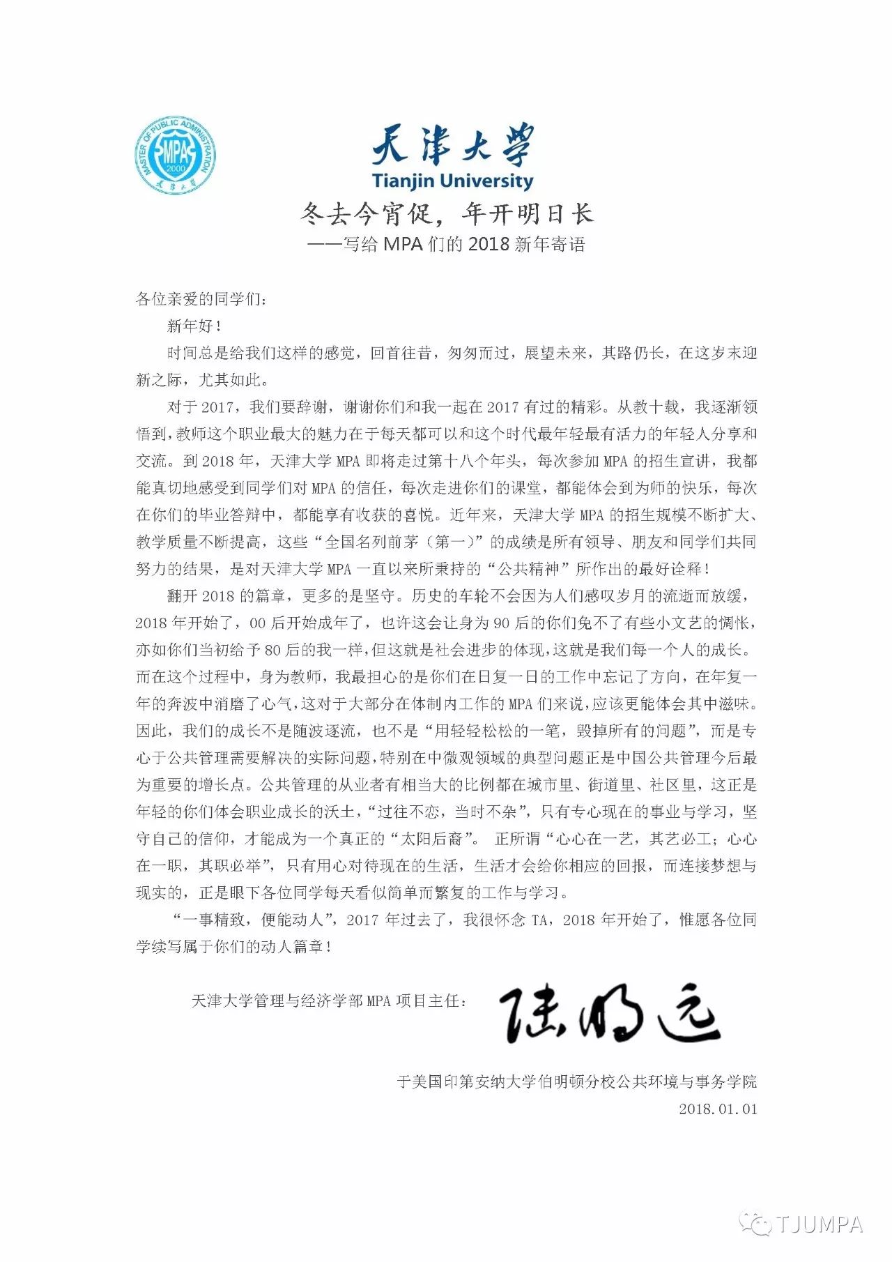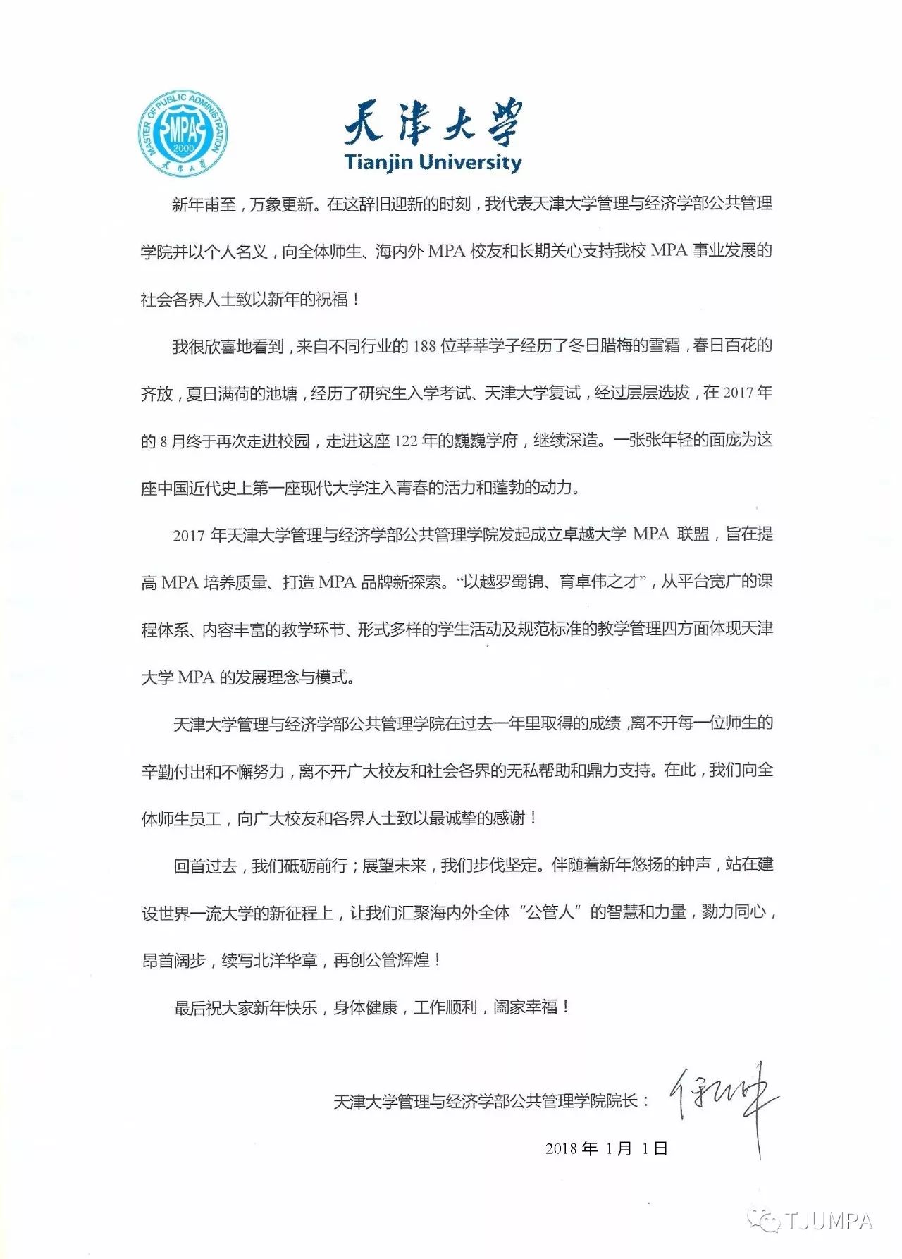 新年甫至,万象更新。在这辞旧迎新的时刻,我代表天津大学管理与经济学部公共管理学院并以个人名义,向全体师生、海内外MPA校友和长期关心支持我校MPA事业发展的社会各界人士致以新年的祝福!