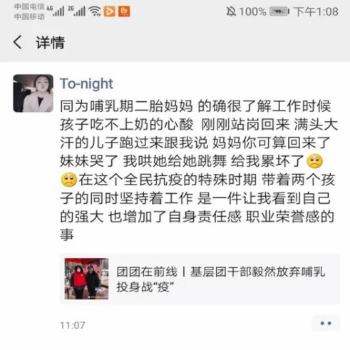 “国家有困难,群众有困难,这个时候就是要我们党员站出来,在基层建立起抗击病毒的铜墙铁壁,我们就一定会取得最终的胜利。”当金晔说这句话的时候,谁也没有想到,每日奋战在社区的她,家里还有两个孩子等着照顾。是的,其实她还有另一个身份,她是一个在哺乳期的二胎妈妈,可是为了更好的完成工作,她放弃了哺乳假期,一心放到社区防疫上。