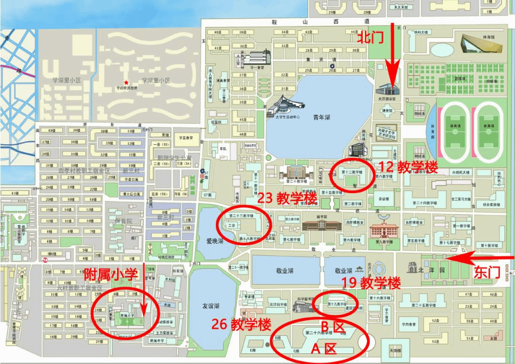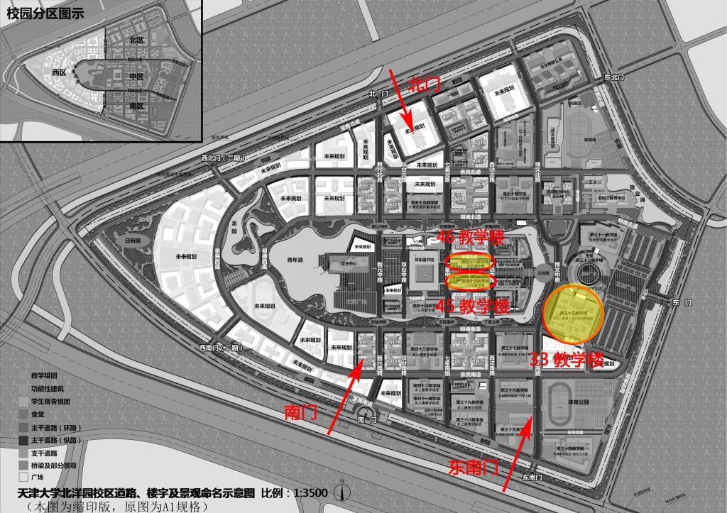 天津大学北洋园校区考场分布在第33教学楼、第45教学楼和第46教学楼,具体校内位置如下图所示。